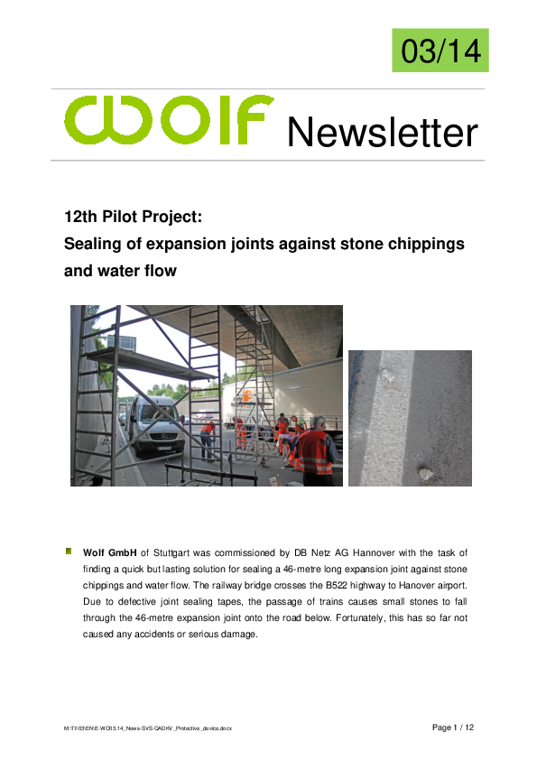 Wolf GmbH, of Stuttgart was commissioned by DB Netz AG Hannover with the task of finding a quick but lasting solution for sealing a 46-metre long expansion joint against stone chippings and water flow. The railway bridge crosses the B522 highway to Hanover airport. Due to defective joint sealing tapes, the passage of trains causes small stones to fall through the 46-metre expansion joint onto the road below. Fortunately, this has so far not caused any accidents or serious damage.