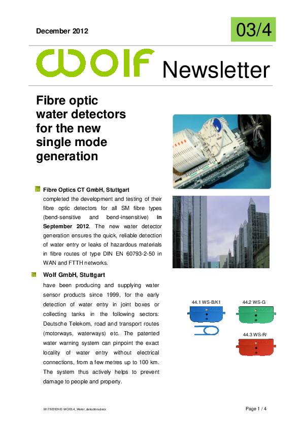 - Fibre Optics CT GmbH, Stuttgart completed the development and testing of their fibre optic detectors for all SM fibre types (bend-sensitive and bend-insensitive) in September 2012. The new water detector generation ensures the quick, reliable detection of water entry or leaks of hazardous materials in fibre routes of type DIN EN 60793-2-50 in WAN and FTTH networks.